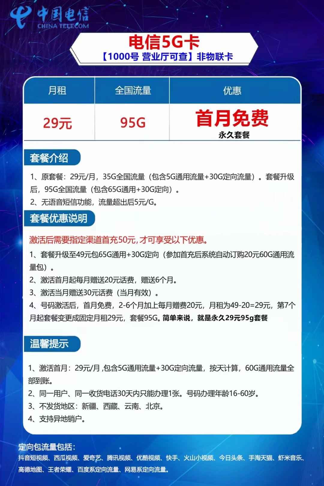 电信5G流量卡原套餐:29元/月,35G全国流量(包含5G通用流量+30G定向流量)。套餐升级后,95G全国流量(包含65G通用+30G定向);10000号及营业厅可查,非物联卡,首月免费!