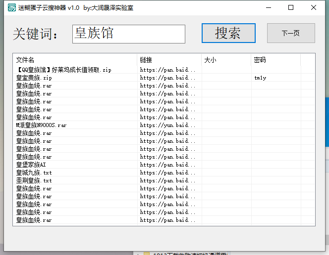 迷糊蛋子云搜神器输入关键词,点击搜索按钮,即可搜索结果;搜索结果都是百度云的链接,右击列表即可打开链接进行下载;功能强大、搜索速度快,能搜到大量学习资源,比其他的都要好用!
