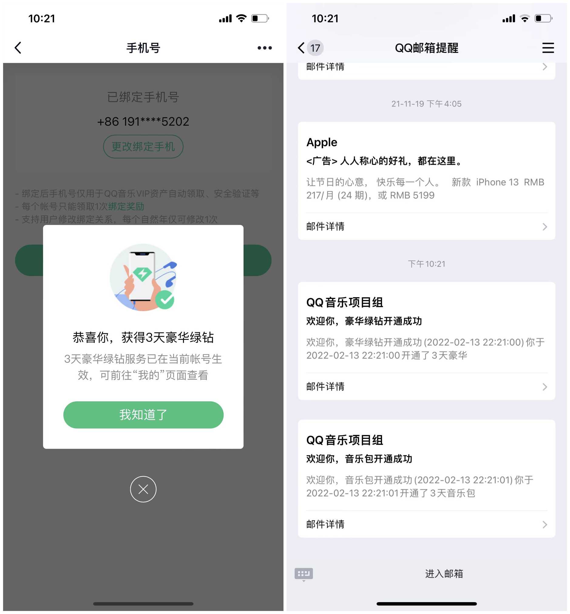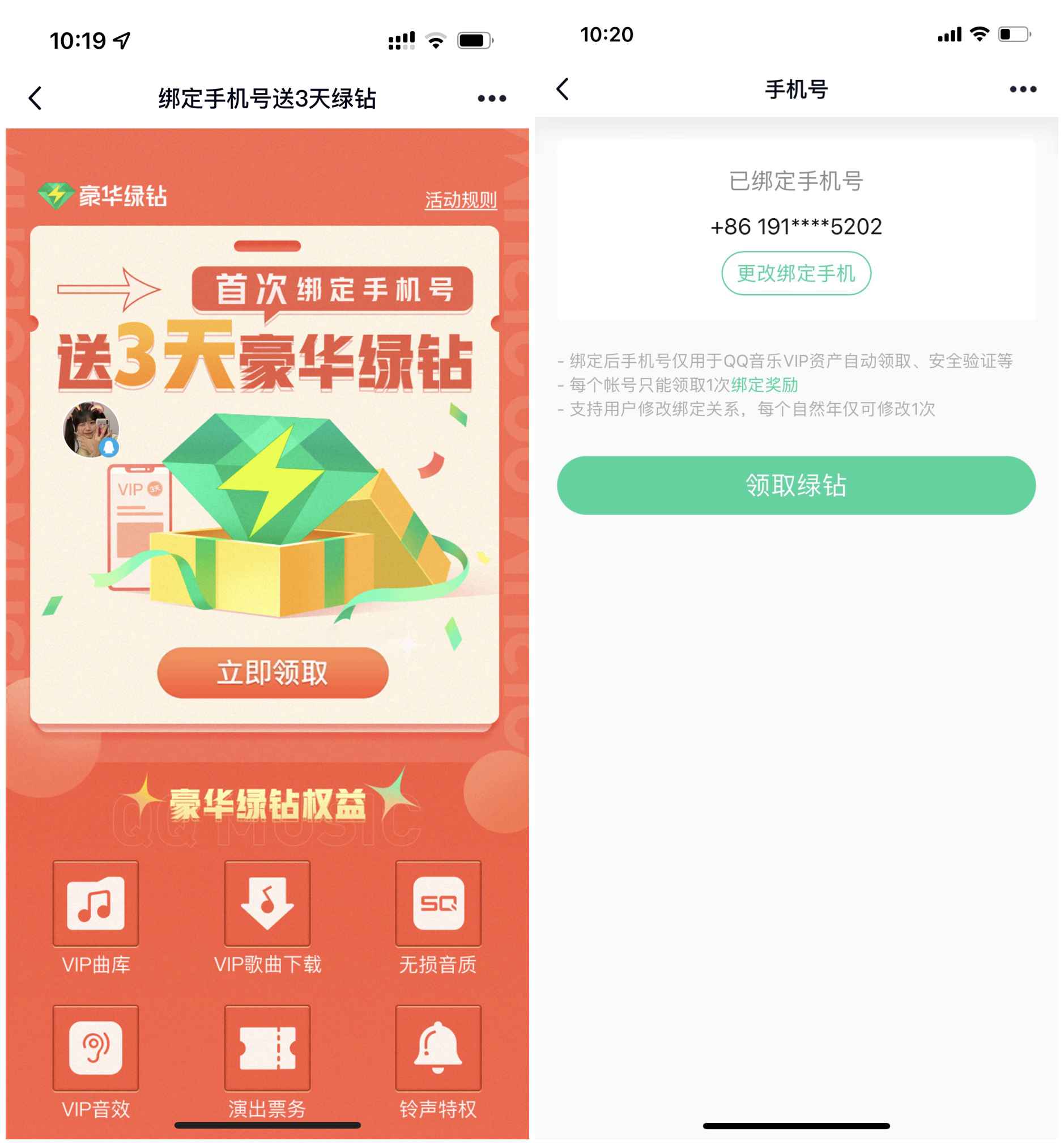 跳转到QQ音乐APP输入手机号码验证绑定,领取绿钻